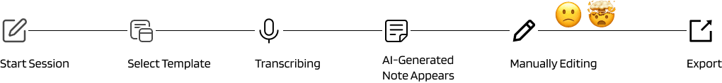 Through visualizing the current user flow of the note transcribing process, we identified areas for improvement in efficiency and highlighted key challenges faced by stakeholders. Specifically, we pinpointed two primary pain points: the excessive editing time required by doctors to finalize documentation, and the lack of accuracy in the initial transcriptions.