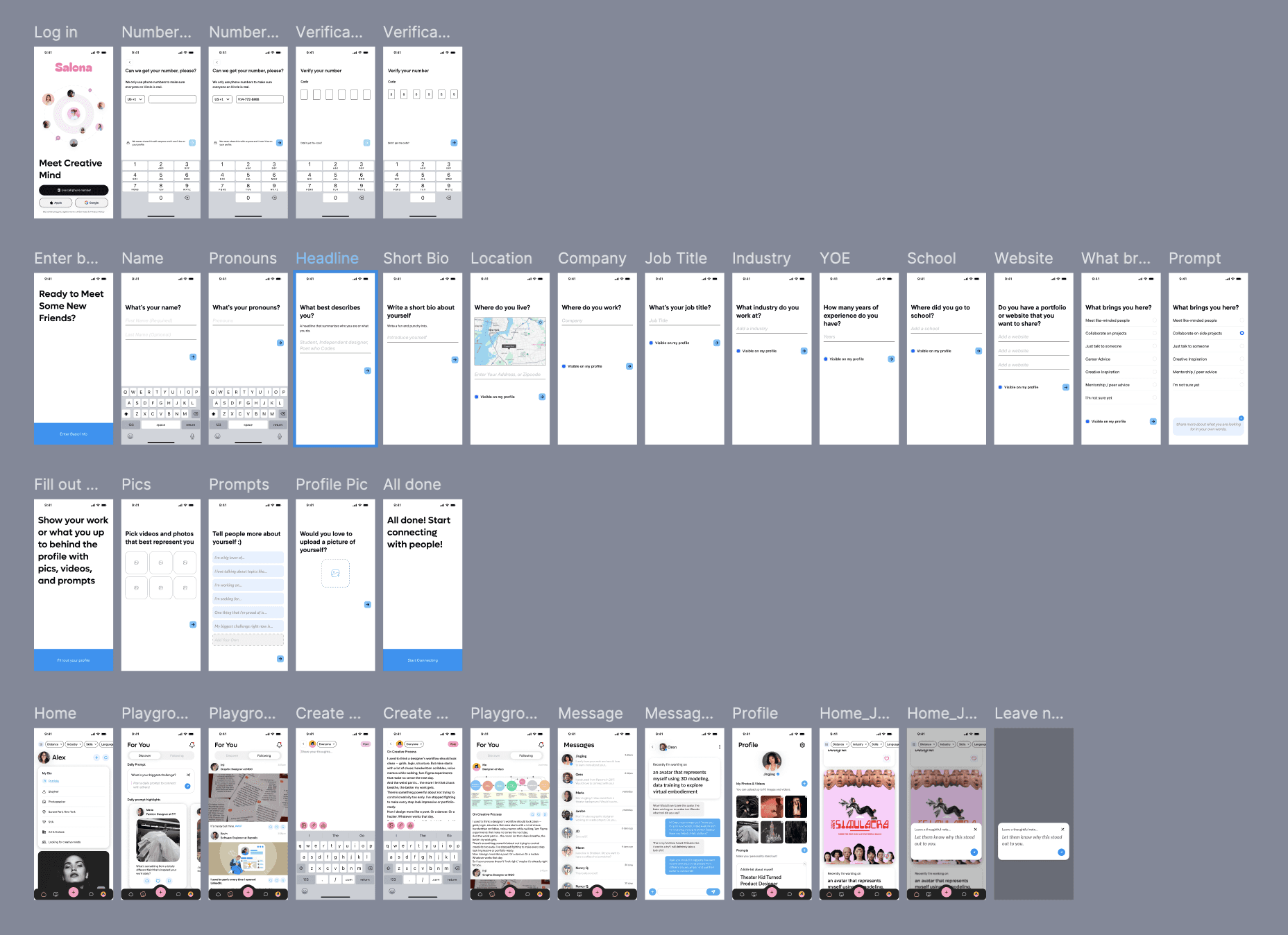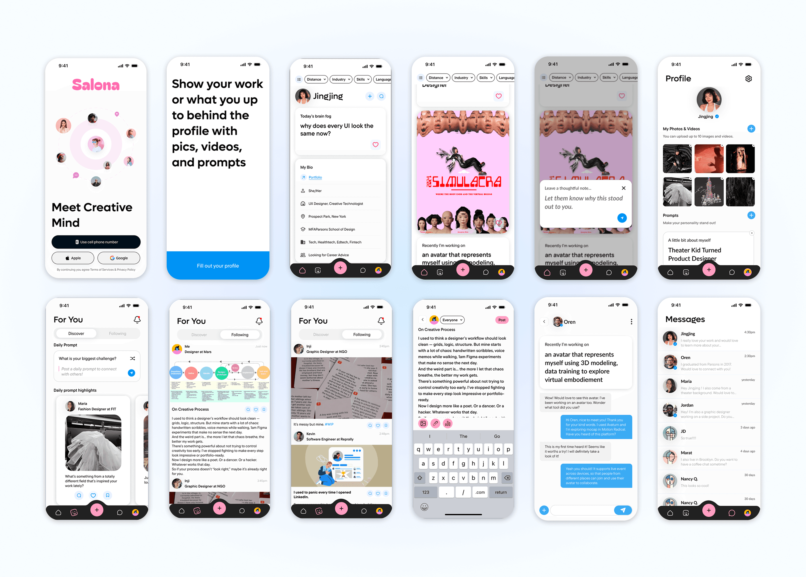 Salona is a professional networking platform designed for emerging creative professionals navigating the isolation, inconsistency, and ambiguity of early-career life. Initially envisioned as a goal-tracking app to foster job accountability, the product evolved into a networking ecosystem focused on connection over credentials, positioned as a more human, creative alternative to LinkedIn.